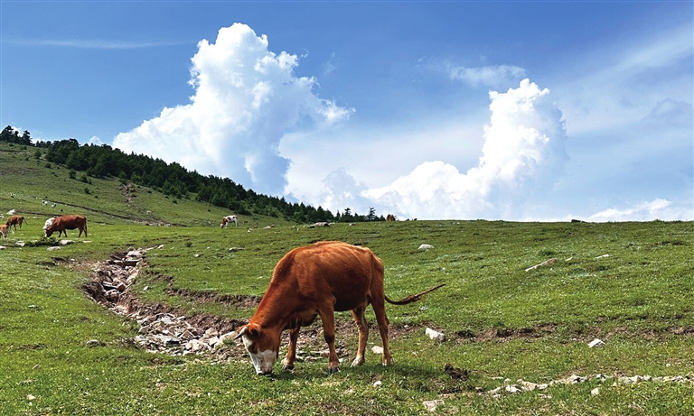 7月18日,娄烦县云顶山上,草丰林茂,白云朵朵,牛群悠闲觅食,生态美景令人目不暇接。