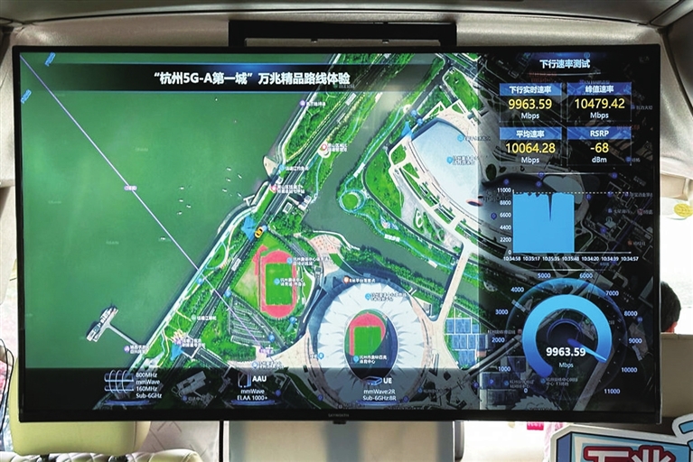 浙江移动在杭州奥体中心至亚运村路段建设了国内首条5G-A万兆网络示范路线。在杭州奥体中心体育场“大莲花”外坐上体验车,记者通过车载电视实时查看到车辆位置和实测网速。