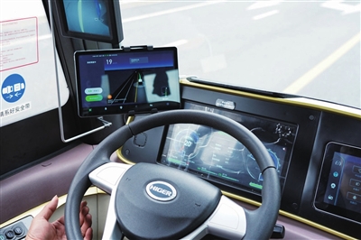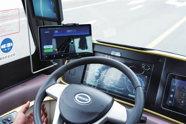 坐上车,车内温度清凉舒适,各类设施齐全,一块长方形屏幕实时显示出当前的行车路线。安全员坐在驾驶位,以便监察车辆自动驾驶的情况。巴士以不超过50公里的时速平稳行驶在路上,遇到车辆超车并线和红灯时,会灵敏感知并缓缓停下。