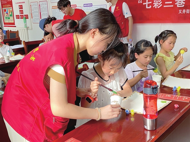 7月19日,义井南三巷社区综治中心联合义井街道新时代文明实践站开展“七彩三巷”暑期活动,社区网格员、太原理工大学化学学院的大学生志愿者为孩子们准备好毛笔、颜料和画纸等材料,向大家介绍了水彩画的运笔、用墨、构图和色彩搭配等知识,并分享了自己的绘画经验,引导孩子们正确认识水彩画,激发其学习兴趣,为孩子们的暑期生活增添了一抹亮色。 周利芳 崔志超 摄