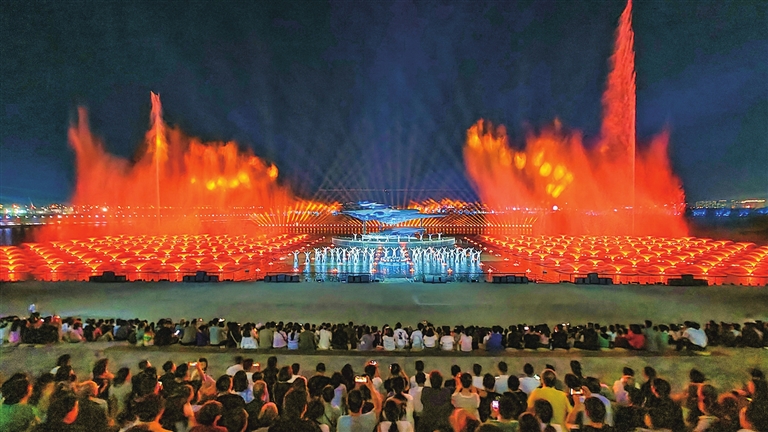 7月20日晚,晋阳湖剧场,众多市民前来观看大型水上实景演艺《如梦晋阳》,在湖光山色间,享受太原夜的魅力。