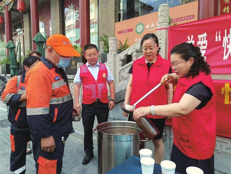 7月19日下午,柳巷街道海东社区党委在山西饭店社区食堂开展“关爱快递小哥情系环卫工人”活动,向辖区环卫工人、快递小哥送上夏日慰问,让他们感受到炎炎夏日里的一片清凉。 郭晓华 刘丽 摄