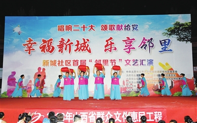 为满足辖区群众精神文化需求,丰富少年儿童的暑假生活,7月22日晚,新城社区在迎新公园开展了首届“邻里节”文艺汇演。现场,演出人员带来了模特走秀、舞蹈、合唱等十余个精彩节目,赢得了在场观众的热烈掌声。 韩睿 王华英 摄