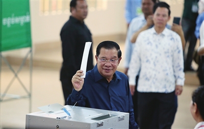 7月23日,柬埔寨首相洪森(中)在柬埔寨甘丹省一处投票站投票。新华社 发