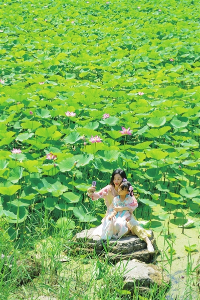 正值伏天,炎热的天气也阻挡不了游人赏荷的热情。7月24日,北大寺村大寺荷风苑,前来赏花纳凉的游客与娇艳的花朵成为夏日一道风景。