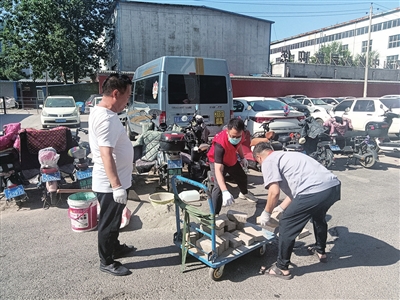 7月23日中午,玉园北社区网格员李芳巡查至玉园路玉门花园小区G区南门外面的一条路上时,发现该路段有个大裂缝,即将形成坑洼塌陷。李芳通过走访附近住户得知,此处塌陷是不久前才出现的,可能是由于之前路面施工不完善、大车碾轧和连日暴晒等因素造成。李芳立即意识到,这个裂缝是个大隐患,此处是车辆行人往来密集之处,如果不马上修复,怕出现意外。为了尽快消除安全隐患,她一面站在路面塌陷附近,提示往来车辆和行人绕道,一面致电社区和物业进行反映。很快,社区安全员王锦涛、物业维修工人艾国臣赶到现场,经社区协调,几个人从附近工地运来沙土、砖块、水泥,当即动手修复路面。见此情景,路过的热心居民王绪民和赵玉璧也加入施工队伍。大家齐心协力,顶着烈日从中午干到下午,终于将塌陷的大坑填补平整,并认真修复了路面、做好了提示标识。