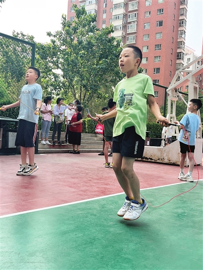 7月21日,滨东社区携手贝壳公益开设“小学生来跳绳”社区体育训练营,丰富孩子们的暑期生活,让孩子体验运动带来的快乐。 周利芳 韩蕾 摄