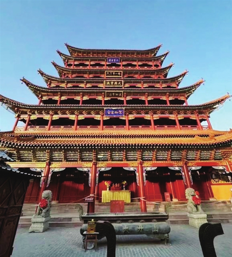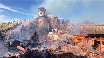 遭遇大火前,山丹大佛寺大雄宝殿,为全木质结构、琉璃瓦盖顶的楼阁,高39米,平面呈长方形,面宽9间,进深7间,重楼七层,飞檐陡壁、金碧辉煌,雄宏壮观。其内泥塑坐像高35米。