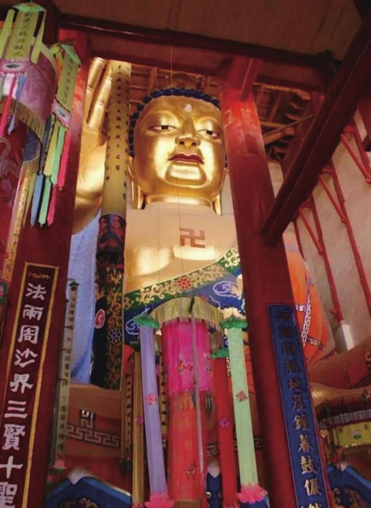 大佛全身金锱彩绘,面部及手、足、胸部皆为贴金,造型逼真,姿态优美,线条流畅,栩栩如生,有威严、慈祥、庄重之感,被海内外佛教界高层人士誉为“天下第一佛”。据考证,为世界室内坐佛之最。