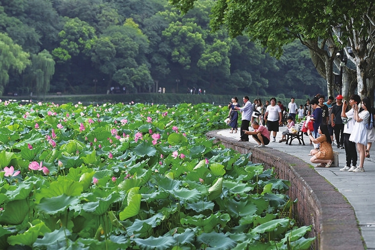 时值盛夏,杭州西湖景区荷花竞相绽放,呈现出“接天莲叶无穷碧,映日荷花别样红”的美丽景象。