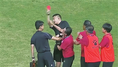 然而,沈阳队替补席上多人抗议不满,陈浩先是向一名替补席人员出示黄牌,随后一直喋喋不休的段鑫突然“爆发”,试图打掉主裁出示的黄牌,手上也一直在指指点点。主裁当即向段鑫出示红牌,而段鑫直接打了主裁一巴掌。