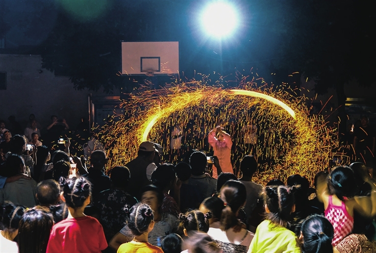 7月25日晚,晋源区姚村镇枣元头村村民在村广场上表演非遗项目风火流星,为山村的夜晚增添了活力。 王韵菲 摄