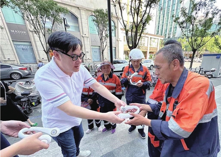 为感谢和致敬辖区一线环卫工人,7月25日,柴市巷社区联合驻地单位,开展“炎炎夏日送清凉”慰问活动,为坚守一线的环卫工人送去挂脖风扇,并叮嘱他们在保障街道整洁的同时注意防暑,确保自身健康和安全。 郭晓华 张 莹 摄