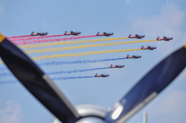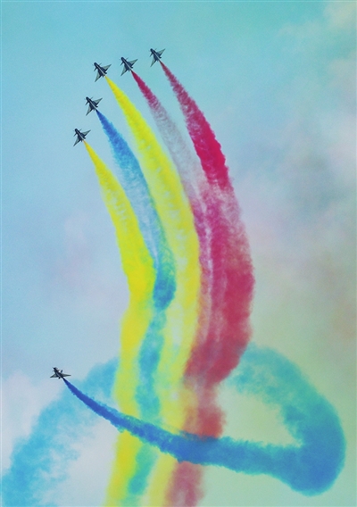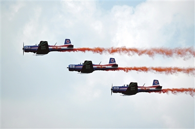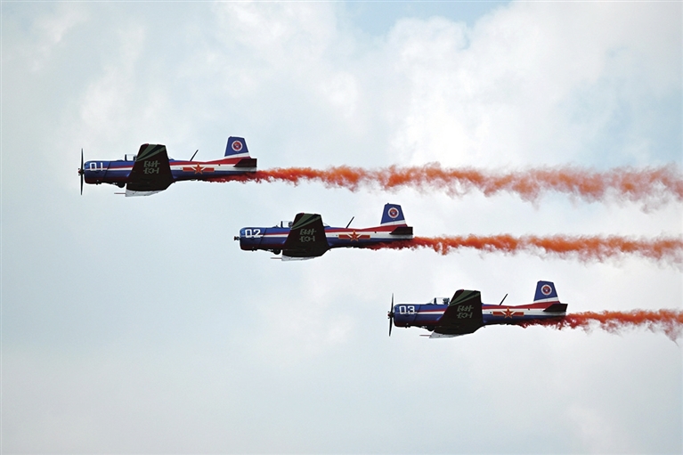 紧接着,8架教-8炫舞蓝天,空军航空大学“红鹰”飞行表演队采取双四机超密集楔队同步起飞,以独特空中礼仪向新飞行学员和观众致敬。16组表演动作连贯流畅,充分展现飞行教官的高超技术和教-8飞机的良好性能。