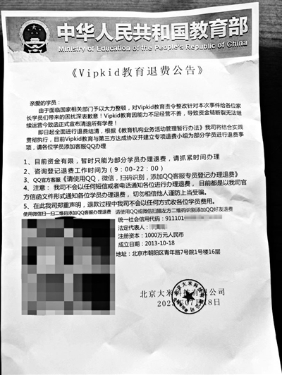 类似“红头文件”并不是个例。小陈在某教育机构交纳5万余元报名学习,机构“跑路”后,小陈和其他同学便一直在寻求退回学费。然而,近期小陈突然收到了一个快递,拆开却发现是另外一家机构的退费公告。这个公告的文件抬头是“教育部”,落款却是北京一家教育科技有限公司,要求用QQ扫描二维码添加客服专员办理退费。