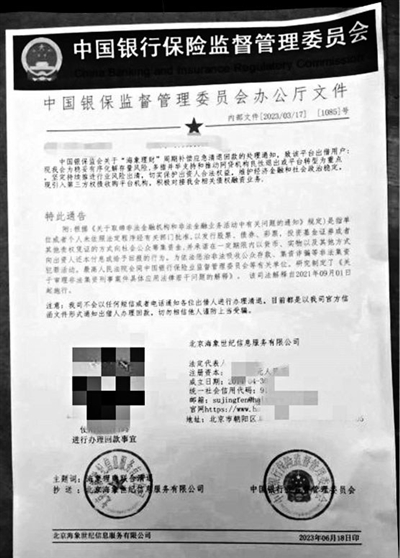 记者看到,这个“红头”退款文件打着“中国银行保险监督管理委员会办公厅”的旗号,落款也加盖了北京某平台和银保监会的“公章”。其中还特别提醒,使用微信扫码进行办理回款事宜。