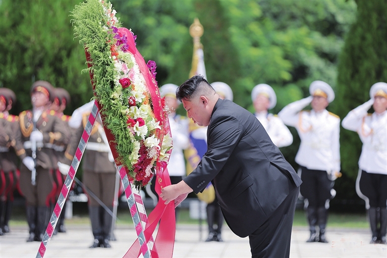 朝鲜人民军仪仗队在烈士陵园整齐列队。现场奏响中华人民共和国国歌和朝鲜民主主义人民共和国国歌。
