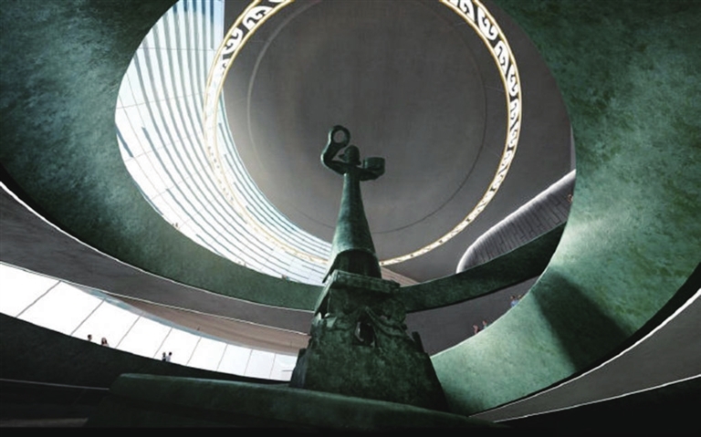 来到这里,在“时空螺旋序厅”,环形的青铜楼梯环绕青铜大立人螺旋向下,与二号馆环绕青铜神树螺旋向上的中庭遥相呼应,向下探秘古蜀之源,向上展开未来之旅,“应天接地”,形成新旧建筑之间的对话与传承。