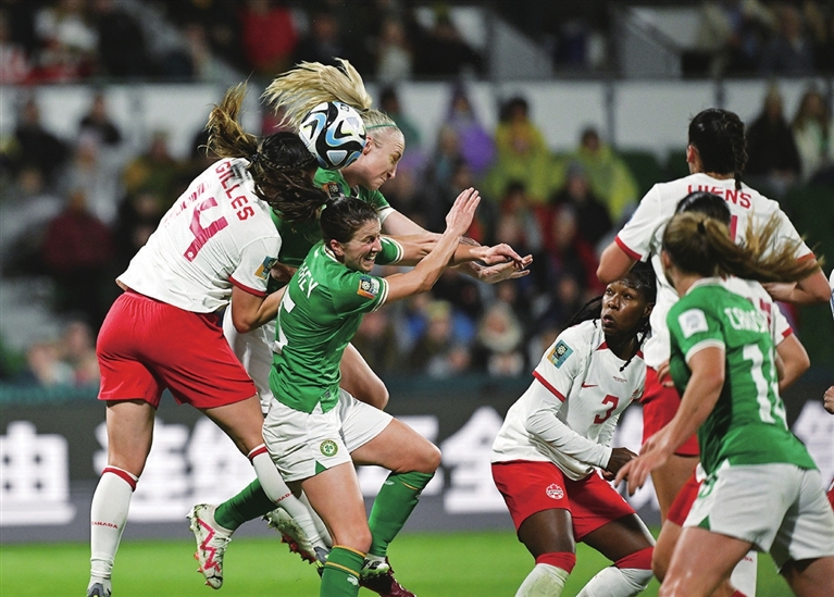 7月26日,加拿大队球员吉勒(左一)与爱尔兰队球员路易斯·奎因(左二)、费伊(左三)在比赛中争顶。当日,在澳大利亚珀斯举行的2023年国际足联女足世界杯小组赛B组比赛中,加拿大队以2:1战胜爱尔兰队。 新华社 发