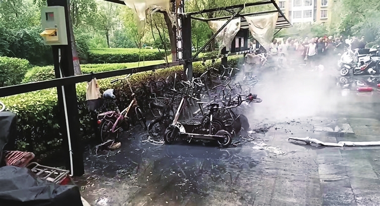当日下午2时30分许,西华苑四期4号楼下的存车棚内突然发生火情。居民们发现后立即进行扑救,并通知物业人员。接到报警后,消防救援人员也迅速赶到现场。经过处置,现场的明火很快熄灭,但有11辆电动自行车和两辆自行车在大火中被毁,未造成人员伤亡。现场人员介绍,火情最先出现在存车棚中部,发现时已经有数辆电动自行车起火,为防止损失扩大,大家奋力采取隔离措施,从燃烧点两头阻止火势蔓延,并将尚未引燃的车辆挪开。“很短时间就烧了十几辆,燃烧非常迅速。”
