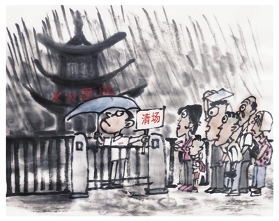 7月29日,贵州贵阳甲秀楼景区下起了大雨,游客欲进场躲雨,随行还有老人孩子,全身淋湿。工作人员却以马上下班清场为由,拒绝游客进景区门内躲雨。《旅游法》规定,旅游者在人身、财产安全遇有危险时,有权请求旅游经营者、当地政府和相关机构进行救助。 (《广州日报》7月31日)