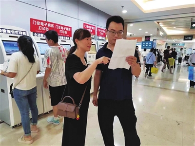 在就诊室门口排队等候间隙,见刘阿姨有点儿忐忑。李梦一直安慰她,“别紧张,现在医疗手段先进,总会有办法的。”很快,便轮到了刘阿姨就诊。就诊期间,面对医生的询问,李梦对刘阿姨的症状病史能做到细致补充、对答如流。医生开了检查单后,李梦便开启了她的“忙碌”模式:有的检查在楼上,有的在楼下,每项检查都需要在不同分诊台确认、排队等候。李梦对检查流程很熟悉,“哪项检查时间长、要先去哪儿排队”她心中有数。安排好顺序,李梦带着刘阿姨穿梭于医院的不同楼层,完成检查、取结果。