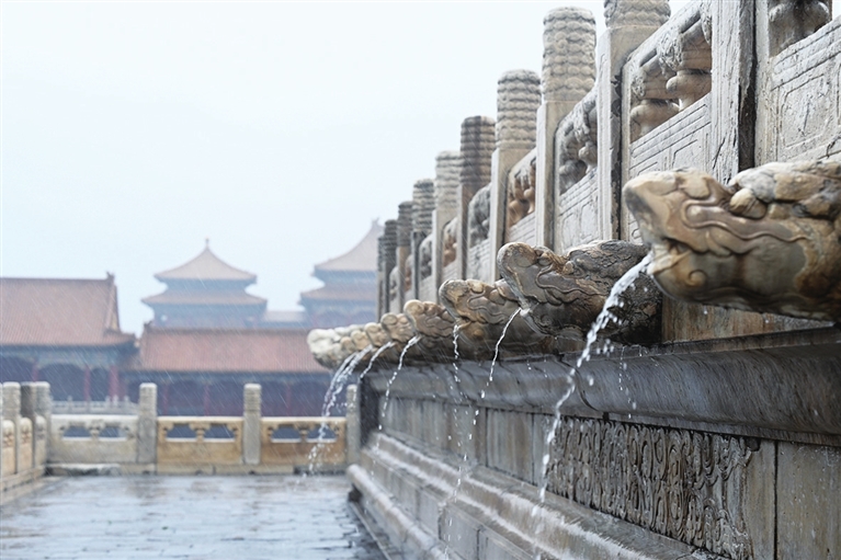 连日,北京迎来强降雨天气,故宫再现“九龙吐水”,依靠精妙的排水系统,宏大的故宫建筑群,在暴雨中安然无恙。紫禁城的雨水排水系统始建于明代,故宫的地面顺应北京地理环境特点,整体走势呈北高南低、中间高两边低,而且略有坡度。这一坡降为自然排水创造了有利条件,使积水能缓慢排泄。故宫保留至今的古代雨水沟的长度超过15公里,其中暗沟长度将近13公里。故宫内的排水沟渠全部通向内金水河,内金水河又与故宫城墙外侧52米宽的护城河相连,并同周边的外金水河、中南海等水系相通。