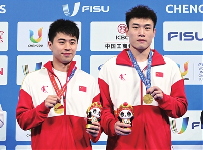 当日,在成都举行的第31届世界大学生夏季运动会男子双人三米跳板决赛中,中国组合黄博文/梁朝辉以397.35分的成绩夺得冠军。 新华社 发
