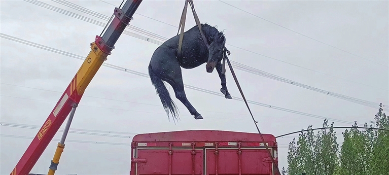 最终,借助大型机械,受伤马匹被重新装进货车车厢。