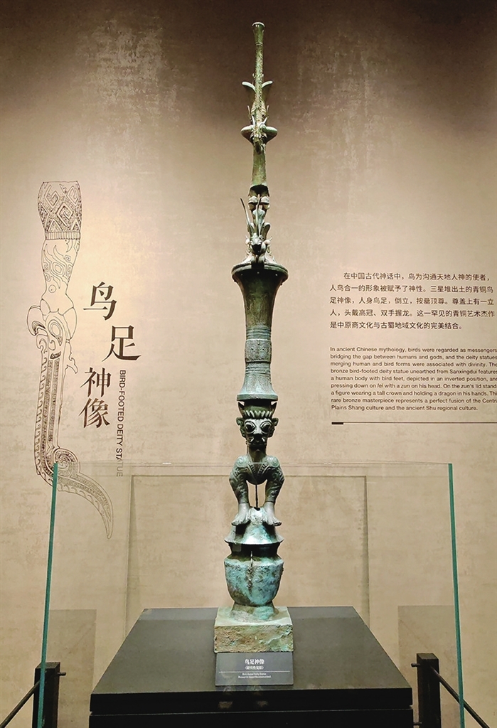 三星堆博物馆新馆二楼,专为青铜鸟足神像辟出展陈单元,参观者莫不啧啧称奇。凸目獠牙、人鸟合体。这尊神像,上着交领锦衣,下穿云雷纹紧身短裙,双足似鸟爪突出。它头顶朱砂彩绘觚形尊,手撑方座罍,身体向后翻起,踏在一对怪鸟之上;一位头戴高冠、缀象牙耳饰、握凤首龙尾法器的“祭司”立于觚形尊之上,脚下卧着一条威风凛凛的龙……神像形态之复杂、内涵之丰富,彰显了三星堆先民浪漫的想象力和非凡的创造力,是中国青铜文明史上独一无二的存在。