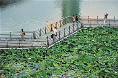 8月2日,长风商务区跻汾桥畔荷花竞相开放,吸引众多游客前来观赏。王韵菲 摄