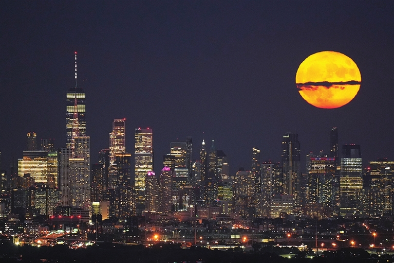 这是8月1日拍摄的美国纽约曼哈顿天际线和“超级月亮”。