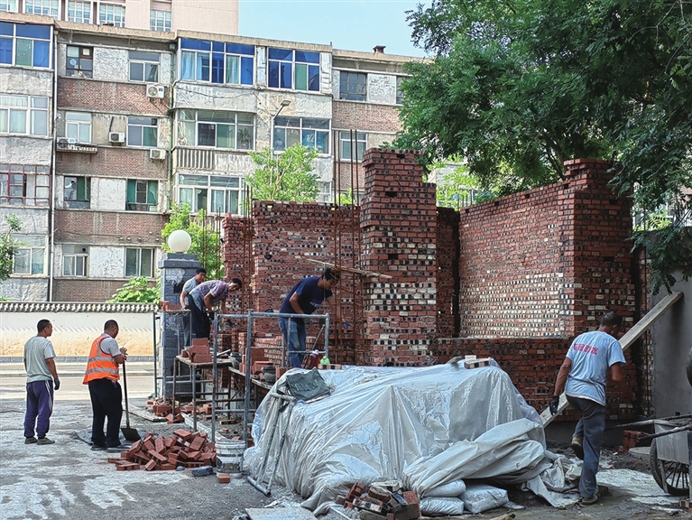 8月1日下午,位于万柏林区兴华街道千峰北路社区的4500厂小区,五六名工人正在砌筑门房和活动室。院内两侧,新铺了人行便道,两栋住宅楼已经完成了节能改造。