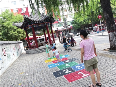 8月3日,为丰富小朋友们的课余生活,培养青少年创新和美学观赏能力,文庙街道新城北街社区组织志愿者,在小广场画上七彩地板画,带孩子们玩“跳格子”游戏。