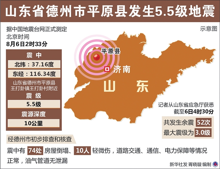 6日2时33分,山东德州市平原县发生5.5级地震,震源深度10公里,震中位于平原县王打卦镇附近。地震发生后,山东省启动Ⅲ级应急响应,组建“省市县现场指挥部”,成立紧急救援、医疗救助、应急通信、交通运输、电力保障、治安维护等12个工作组。组织专业人员和各级干部对平原县12个乡镇(街道)所有村进行了全面排查,同时对德州市全域进行排查。