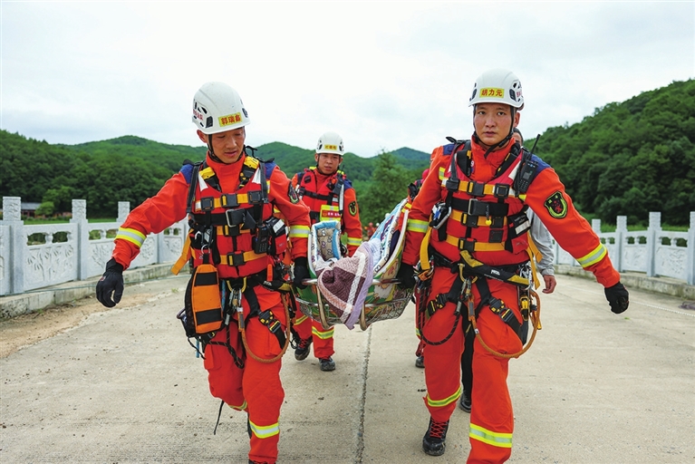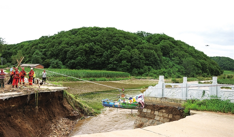 8月6日,吉林市消防救援支队队员利用绳桥解救受困村民。
