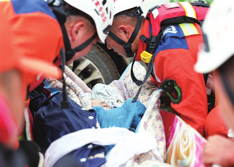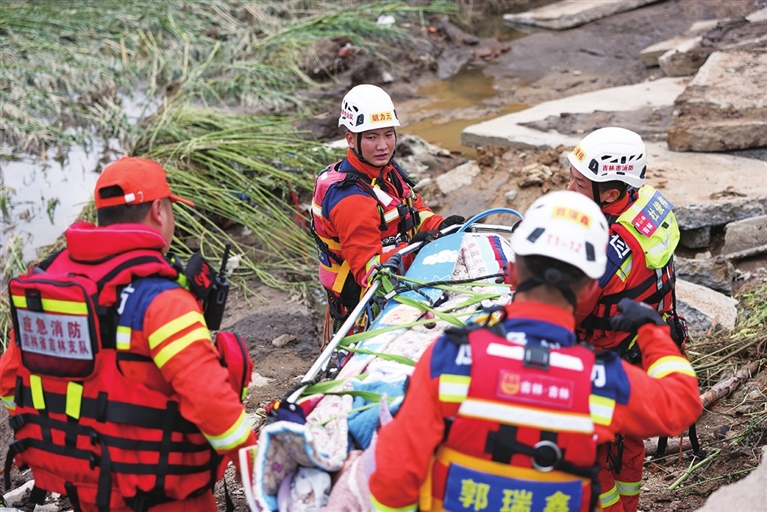 吉林市消防救援支队队员用担架抬着曲凤霞通过损毁路面。