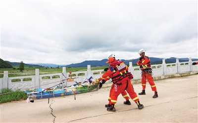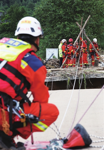 吉林市消防救援支队队员在断桥上搭设绳桥。