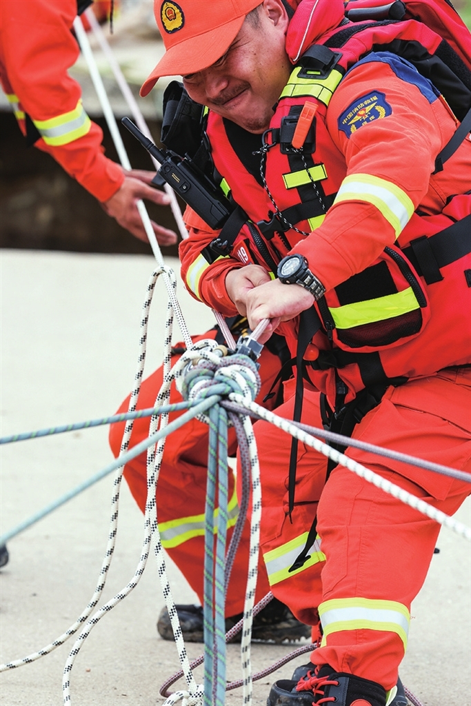 吉林市消防救援支队队员戴维尔用力拉绳桥。