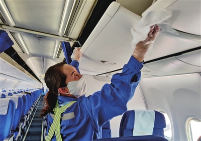 当最后一名乘客走下舷梯,客舱保洁组的组长韩英立刻带着几名同事走进客舱,每个人手里都拎着各种清洁工具以及需要更换的座套。他们要赶在下一波乘客登机前,把过道、座椅扶手、小桌板、行李架、客舱壁等客舱各个角落清洁一遍,还要完成头片、靠垫、毛毯、报纸、杂志等物品的摆放整理。一个重要的原则是,绝对不能超时。
