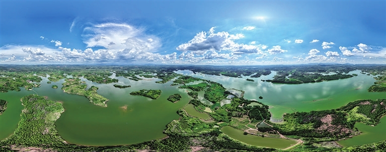 8月6日,湖南桂阳舂陵国家湿地公园,绿水、湿地、蓝天相映成趣,构成一幅秀美的夏日生态画卷(无人机全景照片)。