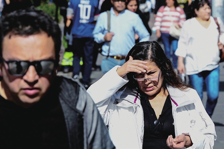 行人在智利首都圣地亚哥街头用手遮阳。近期,正值冬季的阿根廷、智利等南美国家部分地区遭遇异常高温天气。