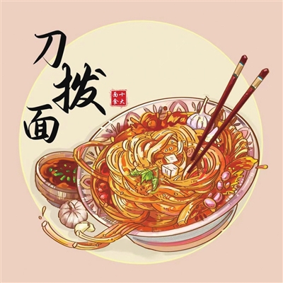 刀拨面的双把刀神技堪称传奇,拨面声音被誉为“万马奔腾”。拨出地面呈三棱形,粗细均匀,长短一致,条条散离,筋道滑爽。最后端上来再加点陈醋和备好的浇头,就一个字,香!