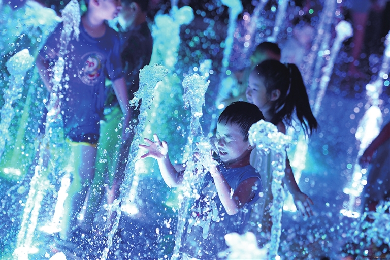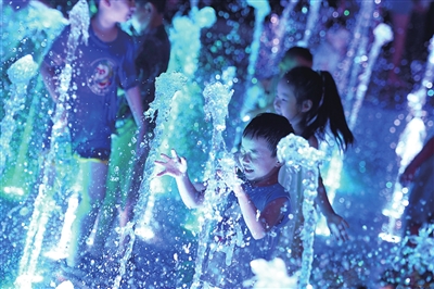 8月10日是“末伏”第一天。8月9日晚,孩子们在铜锣湾广场喷泉边享受清凉。 邓寅明 摄