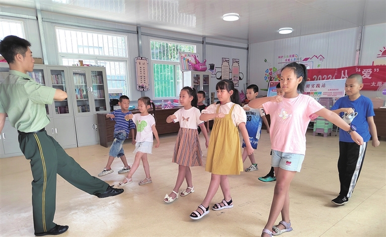 活动中,殷廷堃结合自己在边防服役的经历,向孩子们介绍了戍边军人平时的训练和生活场景,分享了自己的入伍经历及初心。随后,他还给孩子们上了一堂生动的“集训课”,手把手地教他们如何叠出“豆腐块”军被,还训练了孩子们站军姿、正步走等,让他们真正体验感受了部队铁打的纪律。