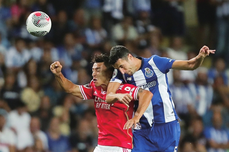 8月9日,本菲卡队球员穆萨(左)与波尔图队球员马尔卡诺拼抢。当日,在葡萄牙阿威罗进行的2023-2024赛季葡萄牙超级杯足球赛中,本菲卡队以2比0战胜波尔图队,夺得冠军。 新华社 发