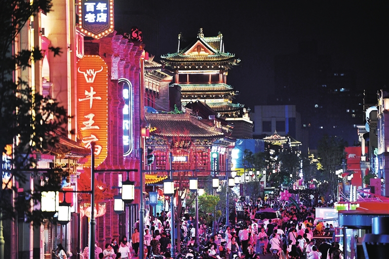 “锦绣太原·清凉避暑”旅游线路发布以来,我市以凉爽的天气和丰富的旅游资源吸引了众多外地游客。8月11日晚,游客穿行在钟楼街,感受太原的厚重历史和现代气息。 邓寅明 摄