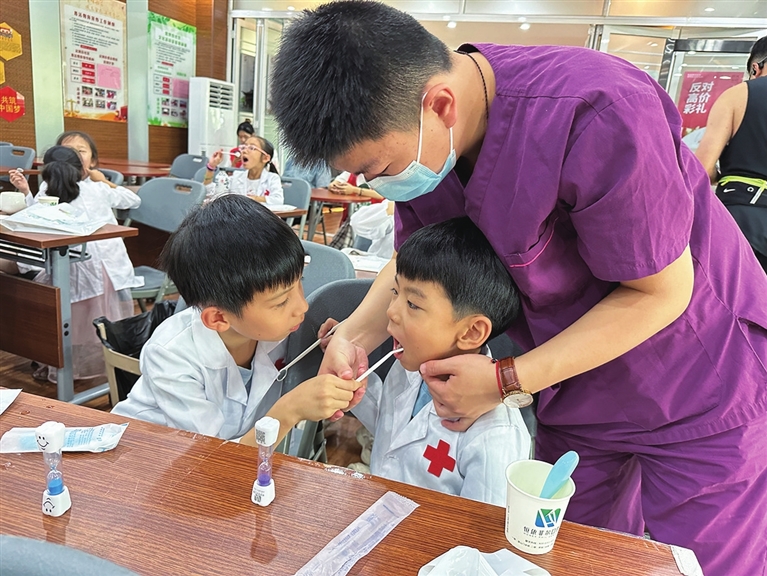 “啊——把嘴巴张开,我们来捉牙齿里的小虫子啦……”8月10日,柳巷街道起凤街社区党委联合辖区口腔医院开展小小牙医口腔义诊活动。口腔科医生用风趣幽默的语言,为孩子们讲解护牙知识,现场还组织孩子们当一回小牙医,以沉浸式角色扮演形式,帮助小朋友认识护齿的方式和重要性,养成良好的口腔卫生习惯。 侯慧琴 苏静 摄