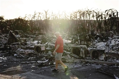 毛伊岛是夏威夷群岛第二大岛,共发现三处野火。拉海纳镇是重灾区,房屋、汽车和树木被大火吞噬,在往日繁忙的商业区,房屋墙壁和地面一片焦黑,许多地标性场所只剩残骸。
