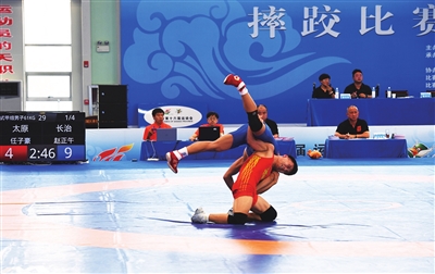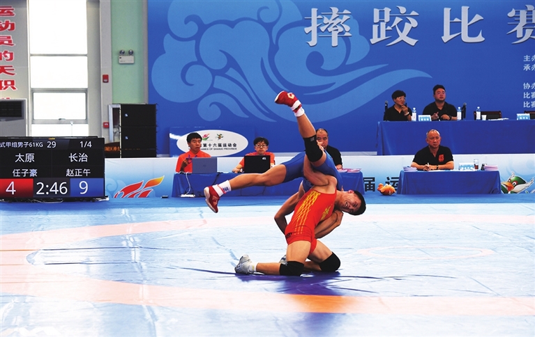8月15日,山西省第十六届运动会摔跤比赛中,我市摔跤队运动员正与对手展开激烈对抗。此次赛事在朔城区神头职业中学校举行,吸引了来自全省11支代表队的425名运动员参赛。 牛利敏 摄